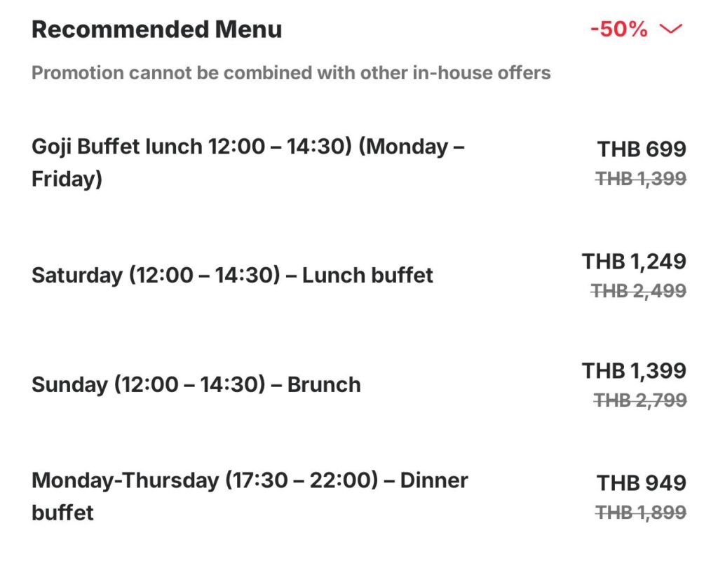 ✅Gojiの公式プロモーションで「Weekday Lunch Buffet Only Monday–Friday … 特別価格 THB 990 net」などの案内あり(キャンペーン時)