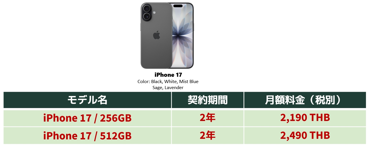 「iPhone 17」は、256GBと512GBの2モデルで、月額料金は「iPhone 16端末無料プラン」よりも100THB安価の2,190THBと2,490THBの2年契約となっております。