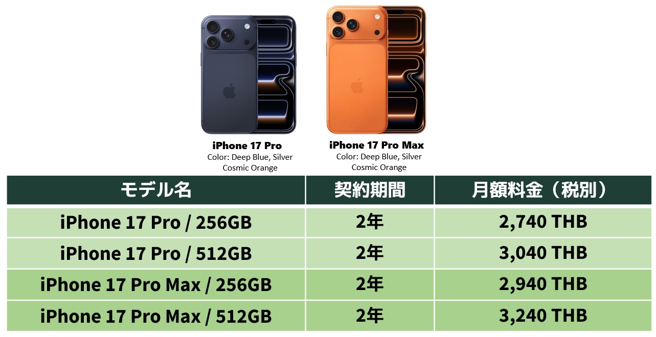 「iPhone 17 Pro」と「iPhone 17 Pro Max」は、共に256GBと512GBの2モデルのラインナップです。Proシリーズは4万THB以上の高額端末ですが、「端末無料プラン」では、月額3,000THBを割る価格帯からご利用頂けますので、年々社用携帯として導入される法人様が増えてきております。