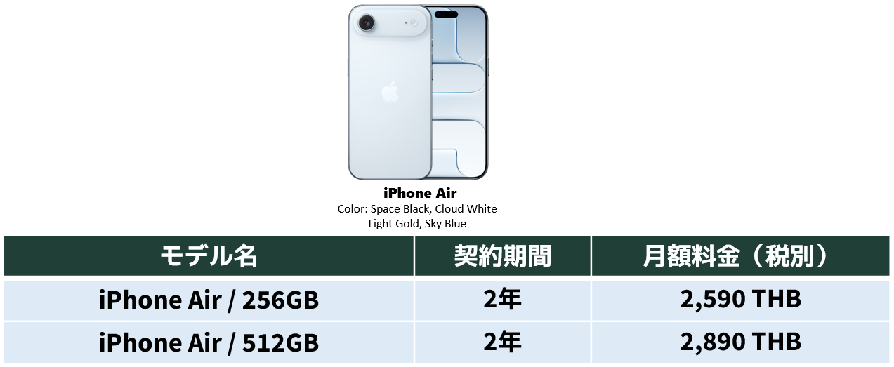 今回「端末無料プラン」に薄型モデルの「iPhone Air」が新登場です。256GBと512GBの2モデルのライナップで、月額料金は2,590THBと2,890THBの2年契約となっております。