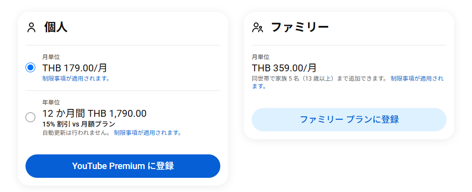 タイ在住の方、長期滞在予定の方は、ぜひこの機会にタイ価格のYouTube Premiumを試してみてください。