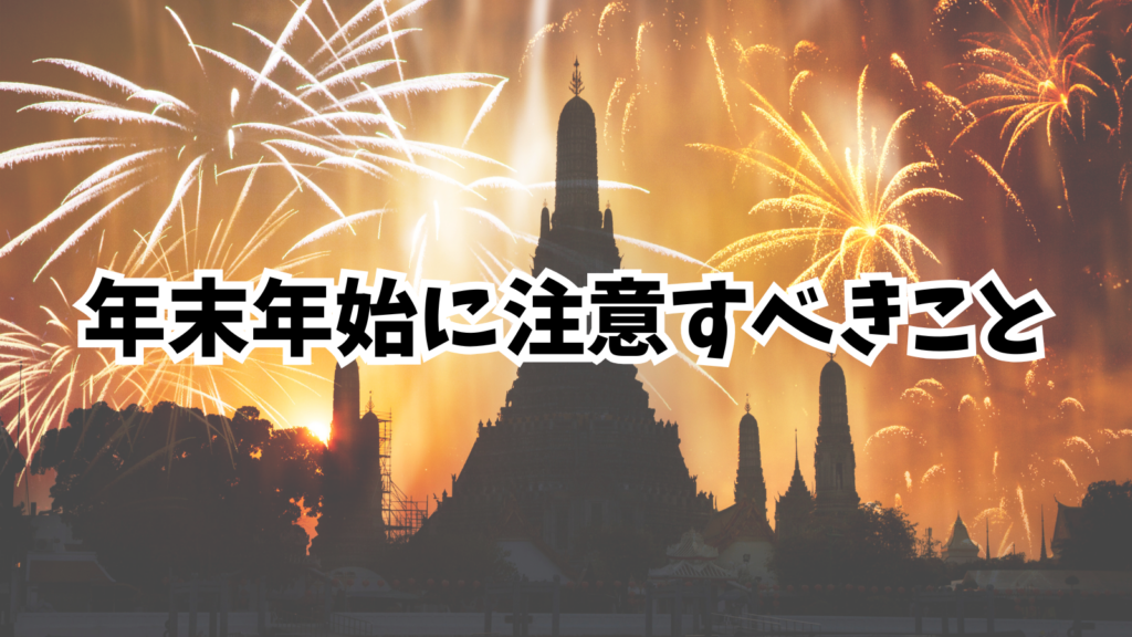 | タイ(年末年始) | 12月31日〜1月1日 | カウントダウン、花火、ライブイベントが盛り上がる |