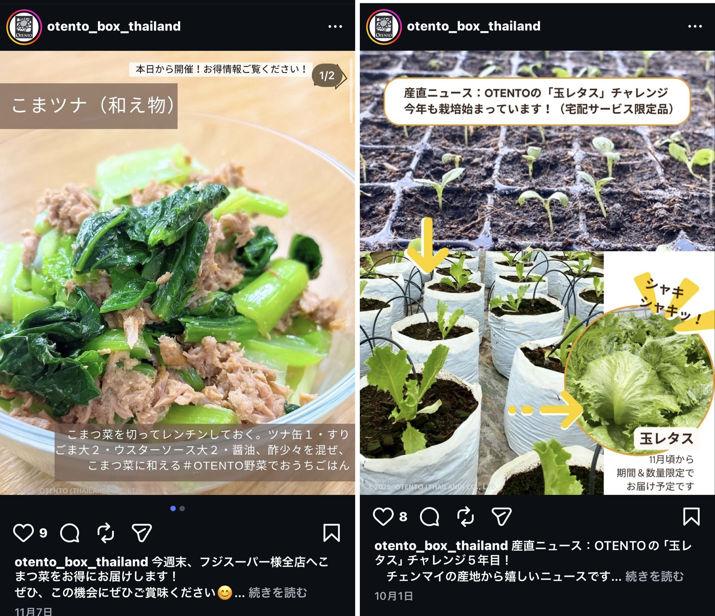 チェンマイなどで地元生産者の方たちと「日本の食卓に並ぶような野菜をタイで」をモットーに野菜を提供している会社です。タイ全域に宅配サービスを行っており、フジスーパー等のスーパーやポップアップイベントにも出店しているので、「OTENTOの野菜買ってるよ!」というタイ在住者の方も多いと思います。
