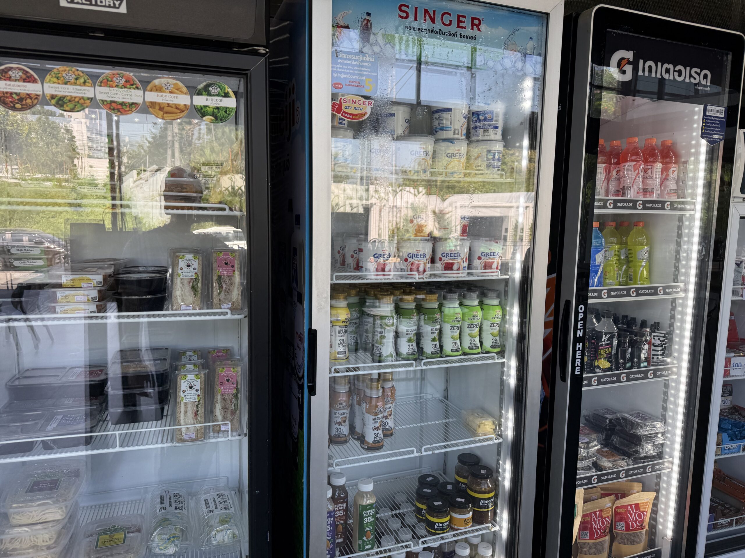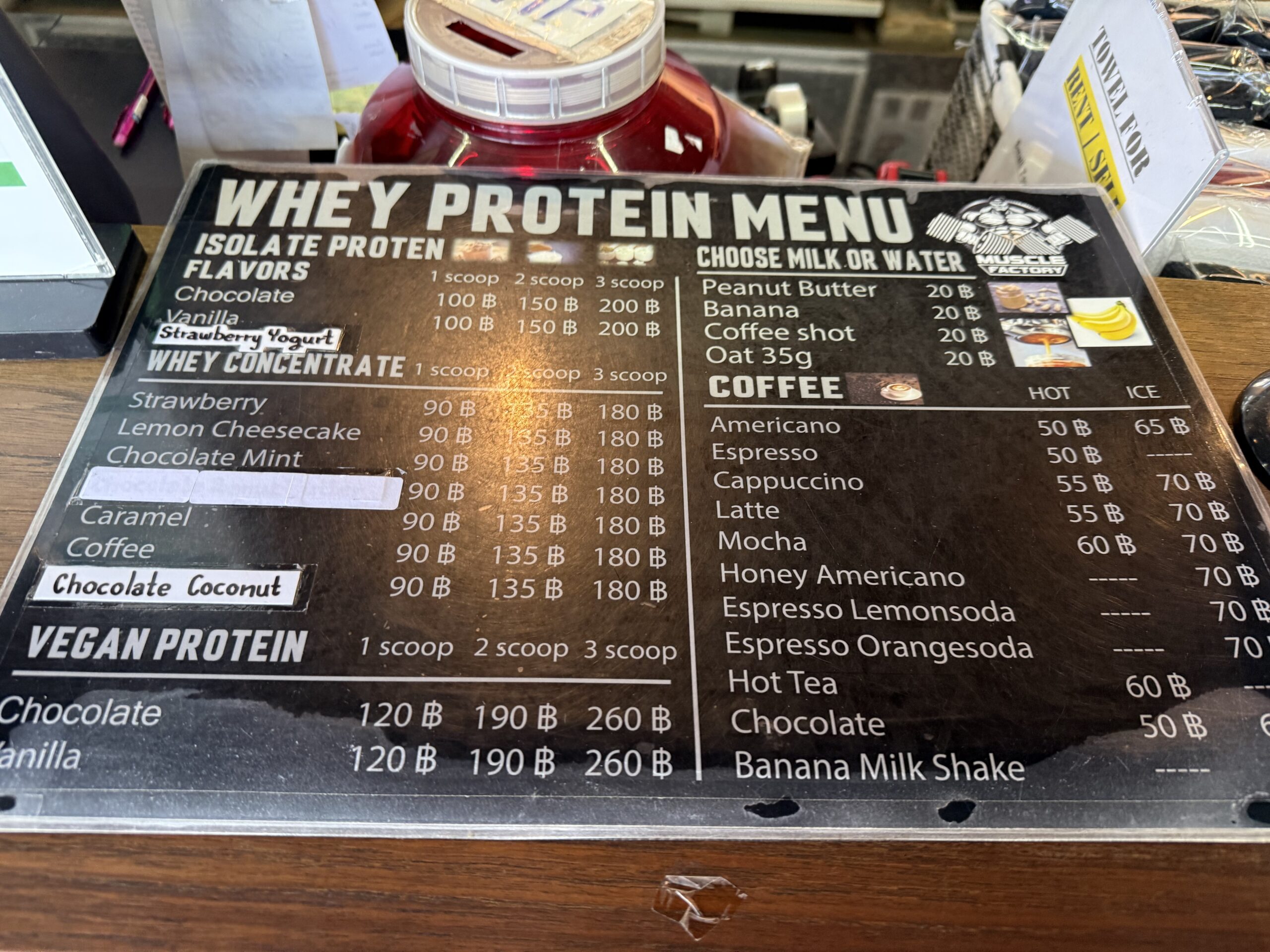 プロテイン、プレワークアウト等のサプリ類の販売や、プロテインシェイク、や鶏肉、ブロッコリー、卵などのお弁当も販売されています。