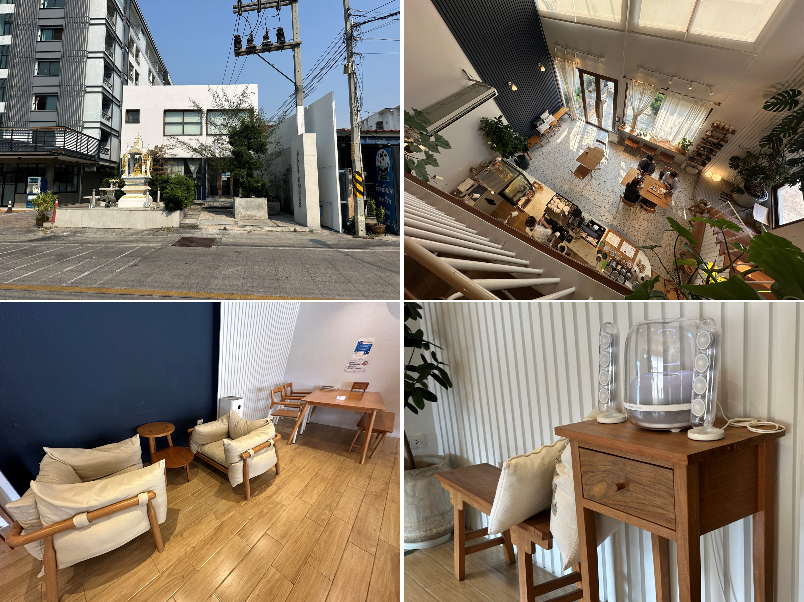 BLUE HOUSE CAFEは、ガオキロ沿いに佇むシンプルで上品な一軒家カフェ。白壁にさりげなく施された「BLUE HOUSE」のロゴが印象的で、外観からすでにセンスの良さが伝わってきます。