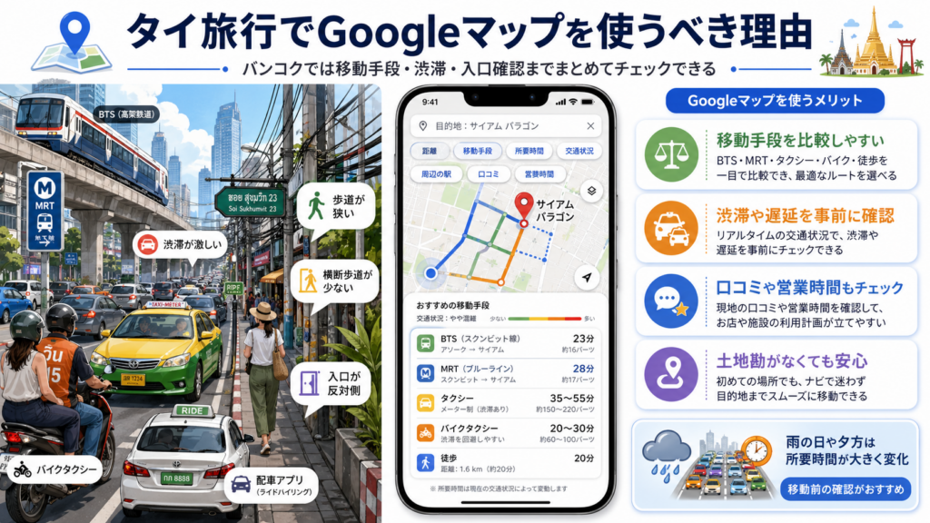 バンコクはBTS、MRT、タクシー、バイクタクシー、配車アプリ、徒歩移動が混在する都市です。地図上では近く見えても、実際には歩道が狭い、横断歩道が少ない、渋滞が激しい、入口が反対側にあるなど、日本とは違う移動の難しさがあります。
