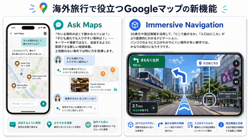 Googleマップは、単なる地図アプリから、旅先での行動をサポートする便利なガイドへと進化しています。特にGeminiを活用したAsk Mapsや、より直感的なImmersive Navigationによって、今後は「場所を探す」「移動する」「現地で迷わない」という体験がさらに便利になっていくでしょう。